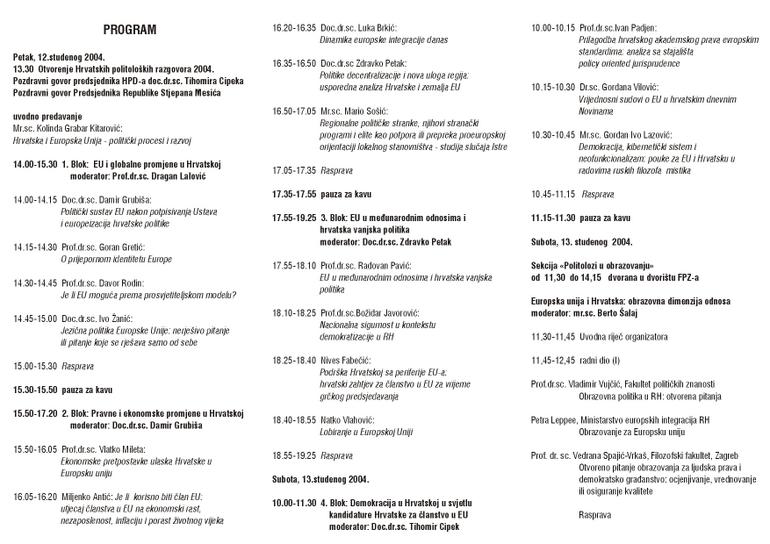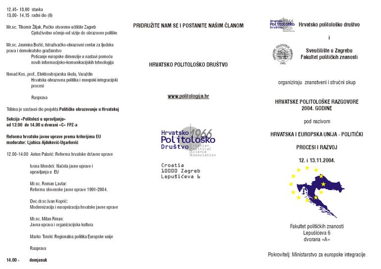 2004_Hrvatska i Europska unija- politički procesi i razvojZahvaljujemo svim kolegicama i kolegama politolozima koji su sudjelovali u radu ovogodisnjhm "Hrvatskim politoloskim razgovorima" na temu " Hrvatska i Europska unija - politiki procesi i razvoj", koji su održani pod pokroviteljstvom Ministarstva za europske integracije. Nasi gosti su bili Predsjednik RH Stjepan Mesić, ministrica europskih integracija mr.sc. Kolinda Grabar-Kitarović, veleposlanik Delegacije Europske komisije Jacques Wunenburger, veleposlanik Slovenije Peter A. Bekes, predsjednica Skupštine grada Zagreba Morana Paliković- Gruden i zagrebački dogradonačelnik Milan Bandić. ![]() |